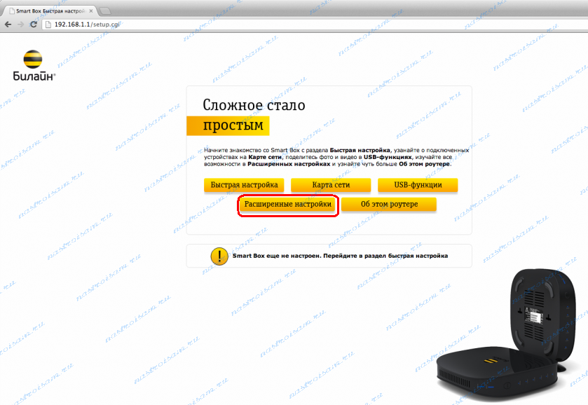 Для того,чтобы перепрошить роутер Smart Box, надо в стартовом меню нажать на кнопку «Расширенные настройки»: