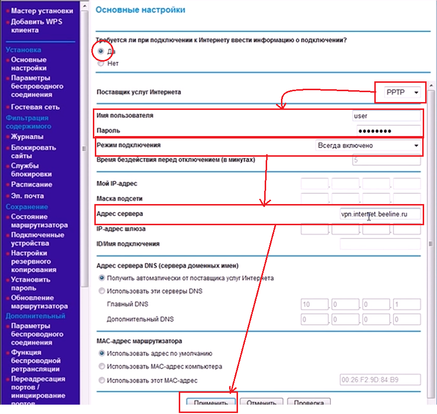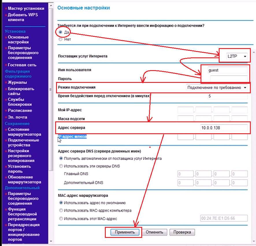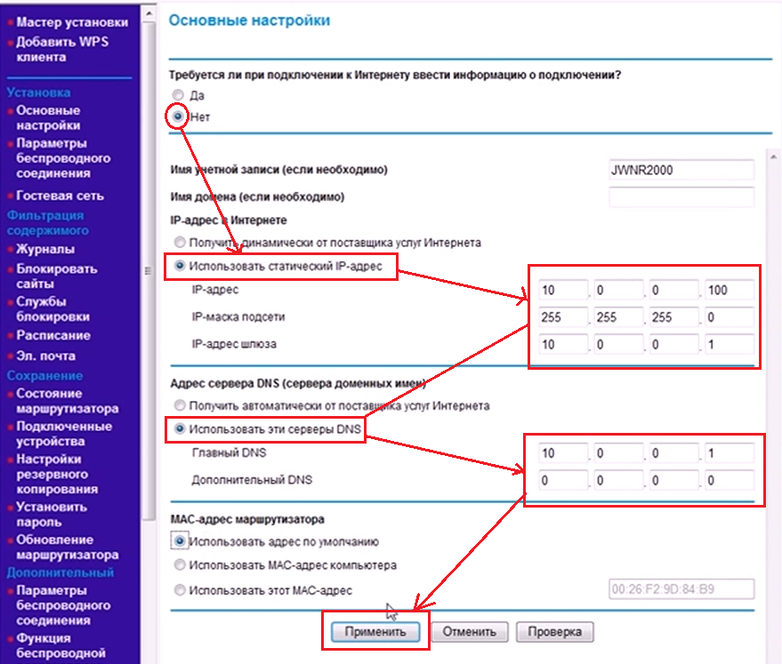 Теперь настройте свой тип подключения, используя одну из инструкций выше (статический или динамический IP, PPPoE, L2TP, PPTP). После изменения всех параметров нажмите на кнопку «Применить» (она уже будет находиться внизу).