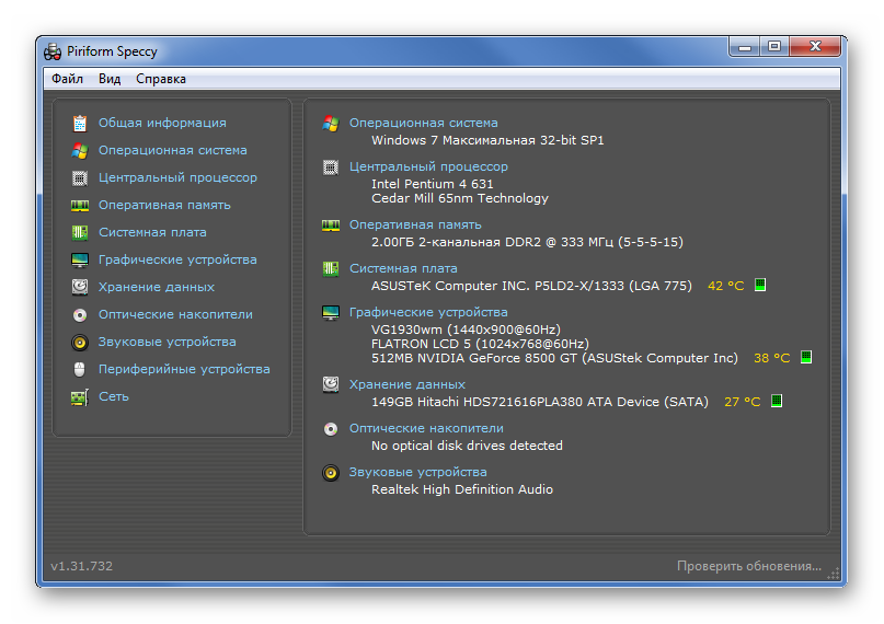 Существует несколько программ, которые могут показывать температуру всех комплектующих ПК. Одно из таких приложений называется . Установите программу и запустите её. Перед вами откроется главное окно, в котором можно найти температуру всех компонентов вашей системы. Если какое-то устройство греется выше 75-85 градусов, в то время, когда компьютер не сильно нагружен какими-либо действиями, то это проблематично. Понадобится проверить и устранить неполадку в системе охлаждения той детали, которая превышает допустимую температуру.