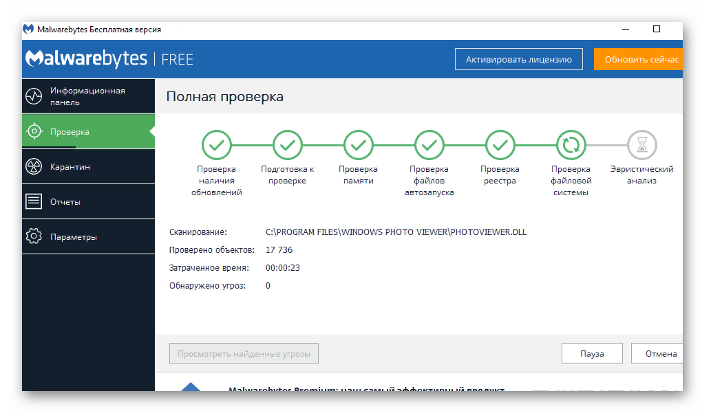 Также существует одна утилита, о которой знают не многие – это Malwarebytes. Она быстро и качественно проверит тысячи файлов на вашем компьютере. Бывают случаи, когда популярные антивирусы не могут справиться с проблемой, а данная программа может. Она имеет бесплатную версию, что делает ее максимально доступной. Возможно данное приложение решит ошибку с проводником. Для этого необходимо скачать ее и установить, а затем запустить сканирование в автоматическом режиме.