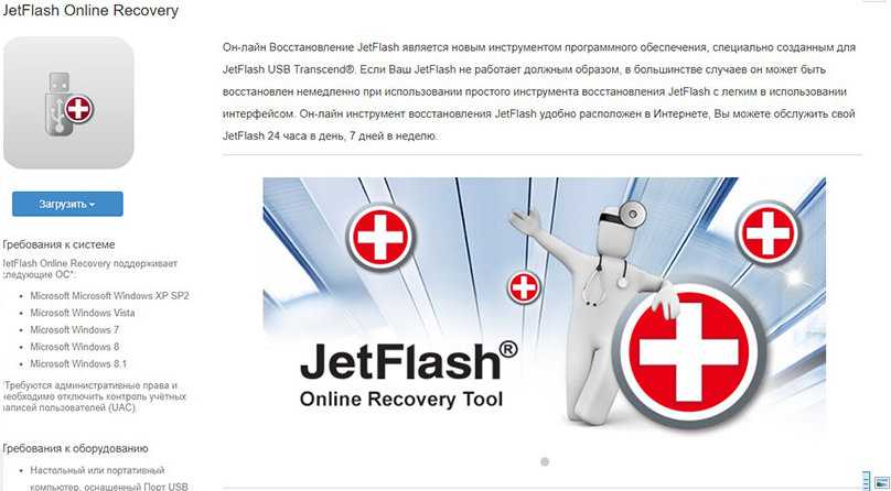 У оригинальных USB -флешек от известных фирм есть специальные утилиты по восстановлению. Их получится найти на официальных сайтах производителей. Например, для устройств компании Transcend утилита называется JetFlash Online Recovery . Она сможет исправить ситуацию, когда Вин 10 не видит флешку этой фирмы.