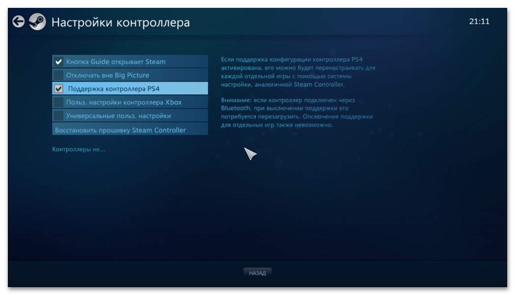 - Выбираем режим отображения Big Picture «Настройки» «Настройки контроллера».