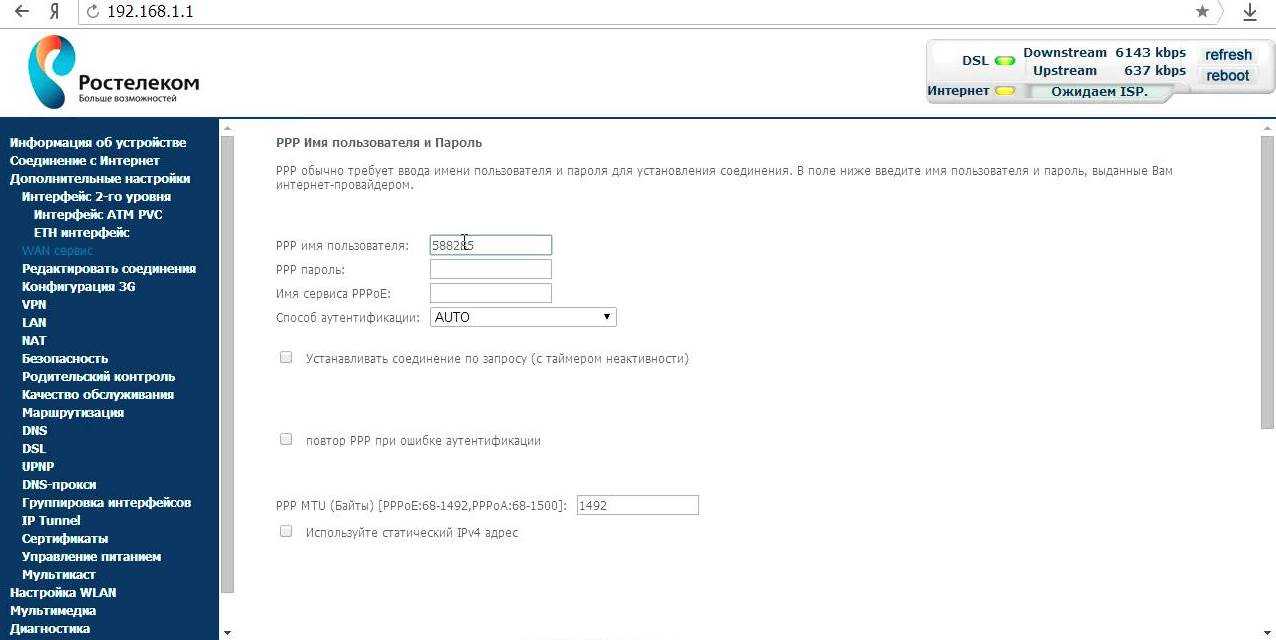 «Повтор PPP при ошибке аутентификации» — обязательно поставьте тут галочку для того, чтобы запрос на авторизацию повторялся при ошибке. То есть, если при соединении с сервером произойдет сбой, то запрос будет сделан повторно через 15 секунд. Время выставляется в пункте «Период повтора PPP». Если у вас часто происходят сбои на линии (пропадает DSL-линк), то можете выставить более маленькое число — например 5 секунд.