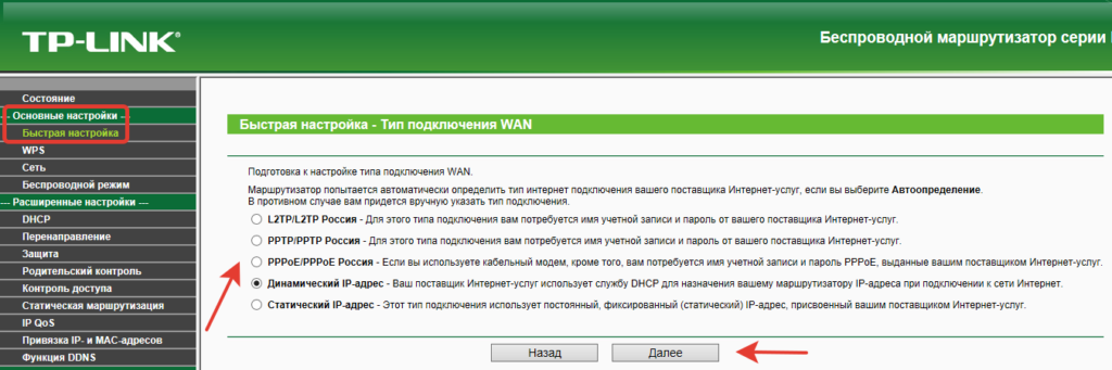Для начала в открывшемся окне нажмите кнопку «Далее», а затем выберите ваш способ подключения. У большинства провайдеров это «Динамический IP».
