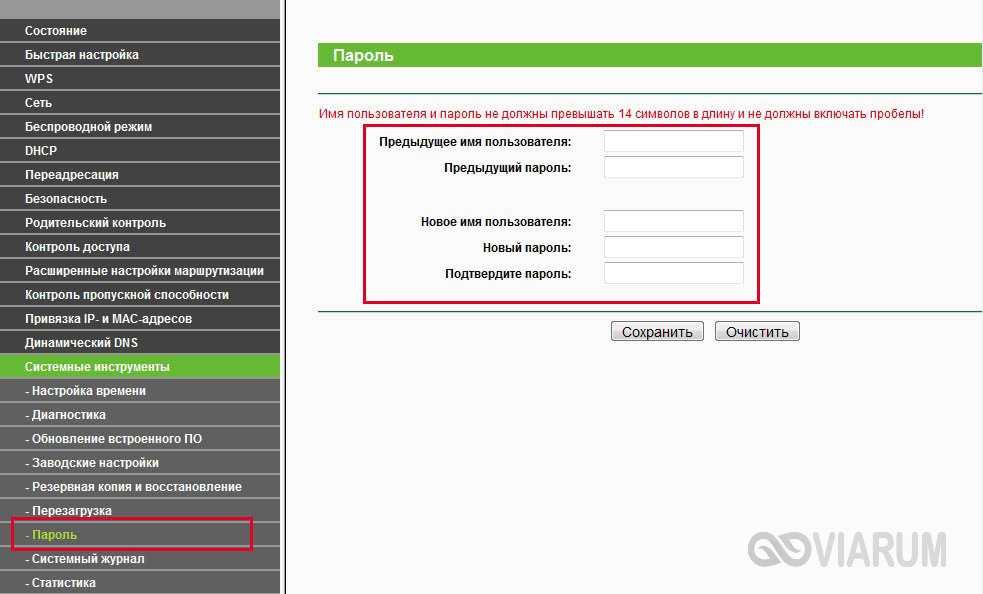 Стандартные имя пользователя и пароль для доступа к административным настройкам делают ваш роутер TP-Link TL-WR841N весьма уязвимым, поэтому лучше сразу же их поменять. Переходим по пути Системные инструменты – Пароль (System Tools – Password). Здесь вписываем старые и новые данные для авторизации (можно поменять только пароль, а имя пользователя оставить admin), а потом нажимаем «Сохранить».