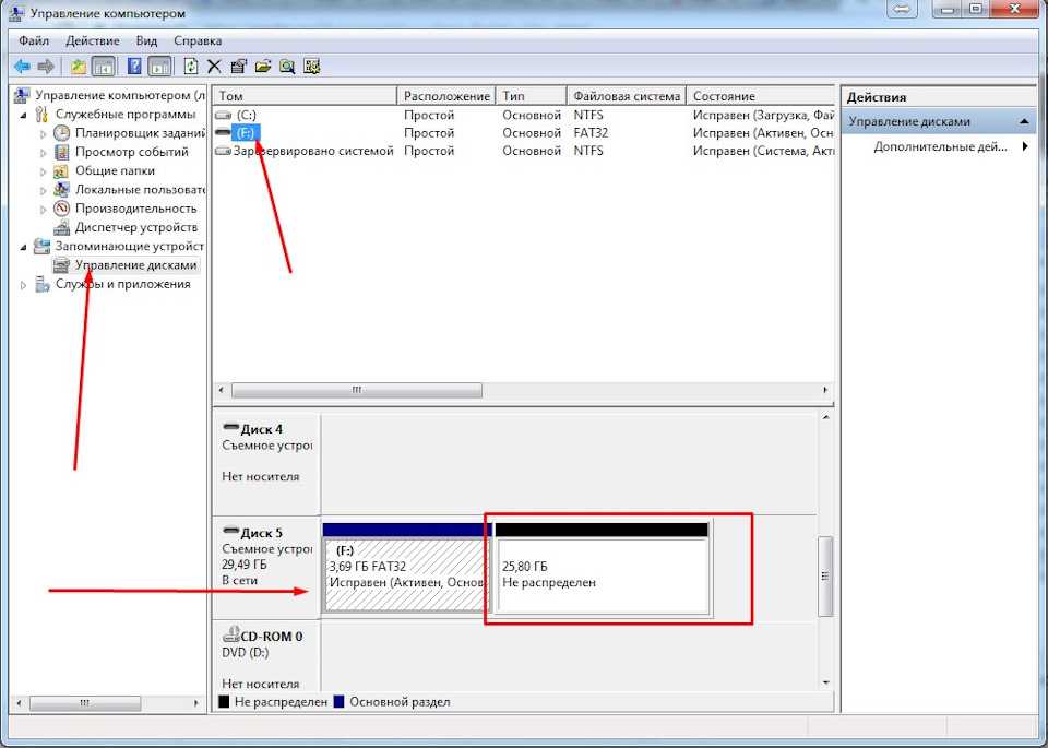 - Появится окно «Управление дисками», в котором вам необходимо найти ваш съёмный диск.
