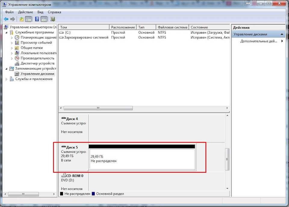 Вы получили полностью чистый носитель, теперь нужно заново его разметить. Выполняется эта процедура через диспетчер задач: