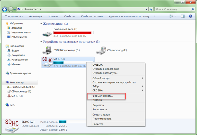 Шаг 2. Запустите «Мой компьютер» через меню «Пуск» или при помощи ярлыка на рабочем столе. В списке устройств со съемными носителями кликните правой кнопкой мыши по SD-карте. В появившемся контекстном меню выберите «Форматировать».