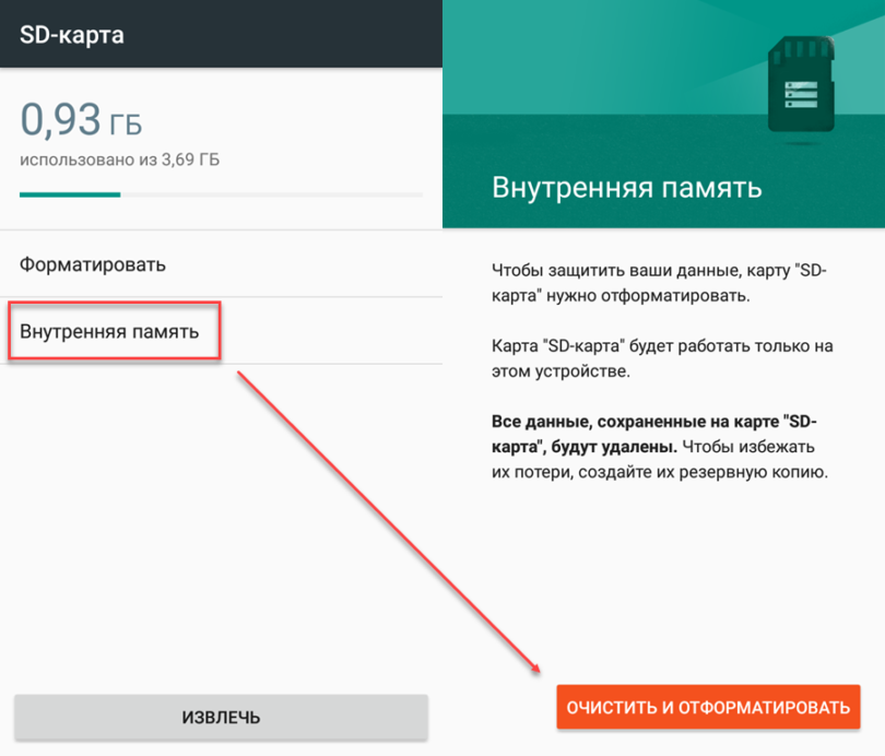 Шаг 4. Нажмите «Внутренняя память», чтобы форматировать microSD и использовать ее в качестве внутренней памяти. Тапните на кнопку «Очистить и отформатировать».