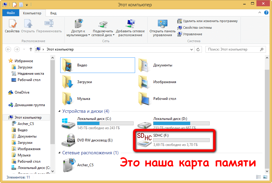 - В течение некоторого времени компьютер будет устанавливать драйвера для нового устройства, после чего необходимо зайти в и в списке подключенных устройств найти SD-карту.