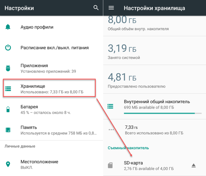 Шаг 1. В системных настройках выберите пункт «Хранилище» и в открывшемся списке тапните на нужный съемный накопитель. В нашем случае это SD-карта, но у вас он может иметь другое название.