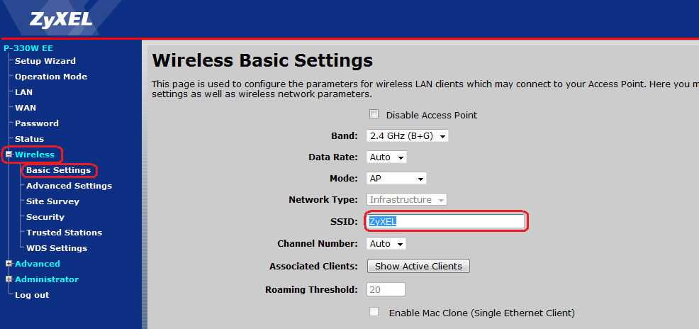 Тип подключения – не единственный параметр, который нужно задать при настройке интернета. Рассмотрим, как произвести другие, не менее важные, настройки. В первую очередь настроим имя сети, которое будет отображаться в списке подключений. Из главного меню переходим в блок «Wireless» и выбираем пункт «Basic Settings». В поле «SSID» указываем имя сети. Вы можете выбрать любое желаемое имя и записать его латинскими буквами.