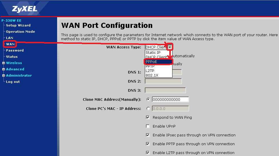 Далее выберем тип соединения. Для этого следует в выпадающем списке найти РРРоЕ (он находится напротив поля WAN Access Type). Порядок выполнения последующих действий выглядит так: