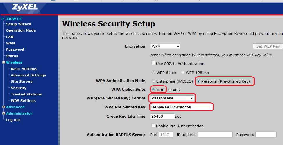 Далее Слева в меню выбираем Wireless, далее Security; и выставляем параметры: Encryption: WPA5. WPA Authentication: Personal6. WPA Cipher Suite: TKIP7. WPA format: Passphrase8. WPA Pre-Shared Key: должны ввести любой набор цифр, длиной от 8 до 63. Их также необходимо запомнить, чтобы Вы могли указать их при подключении к сети.9. Нажимаем ниже кнопку Save;