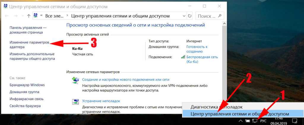 Нажать ПКМ на иконке «Сеть», «Центр управления….». В окне которое появится нажимаем на строку «Изменение параметров адаптера».
