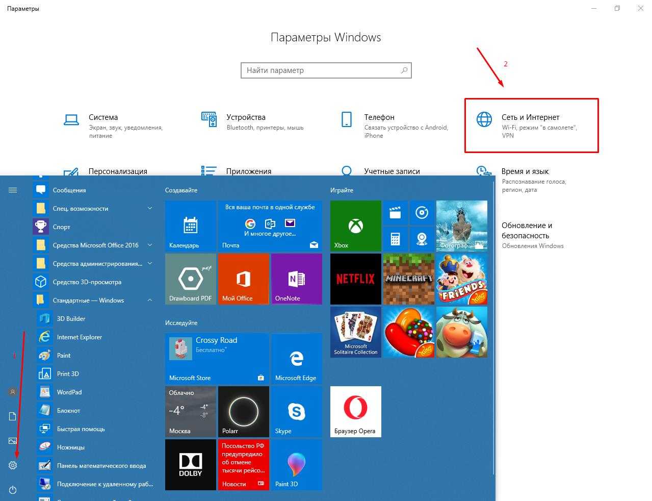 - Используя поисковую строку, найти параметры устройства. Далее — «Сеть и Интернет».