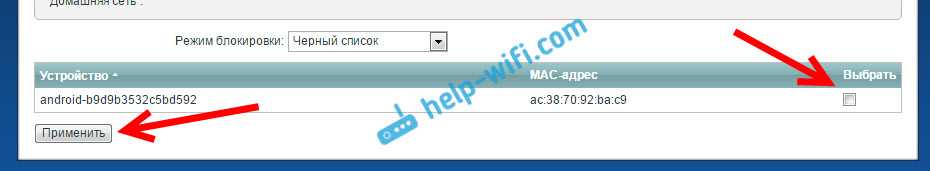 Выделаем галочкой устройство, которое нужно заблокировать, и нажимаем кнопку Применить.