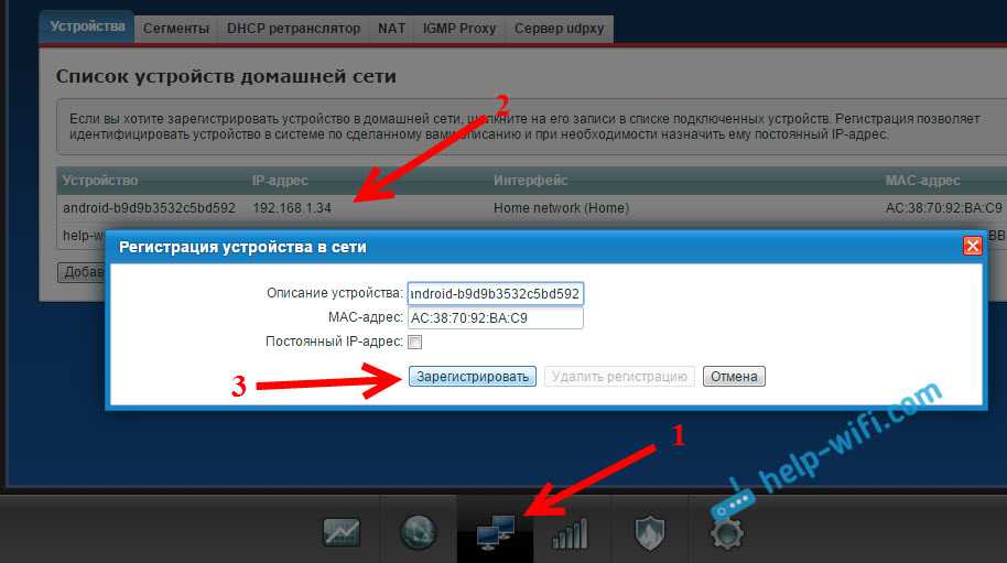 Давайте еще рассмотрим настройку фильтрации по MAC на устройствах ZyXEL Keenetic. Зайдите в настройки своего роутера по адресу 192.168.1.1. Сначала, нам нужно зарегистрировать необходимое устройство в домашней сети. Для этого, снизу перейдите на вкладку Домашняя сеть, нажмите в списке на нужное устройство, и нажмите на кнопку Зарегистрировать.