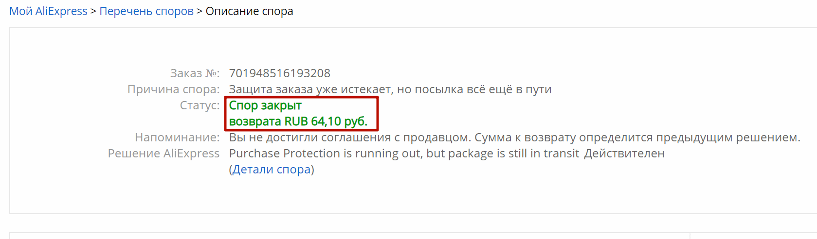 Деньги будут перечислены на счет покупателя в течении двух недель. Они поступят туда же, откуда были ранее сняты (например, банковскую карту, электронный кошелек). Спор автоматически деактивируется после того, как будет произведен возврат финансов. Если продавец откажется принимать предложение о возврате денег, в спор вступит администрация AliExpress. Она рассмотрит все факты и примет решение. На рисунке выше спор был закрыт системой в пользу покупателя с полным удовлетворением его требований.