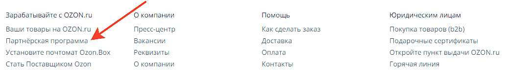 Чтобы зарегистрироваться в качестве партнера, пролистайте страницу вниз и кликните на ссылку “Партнерская программа”.
