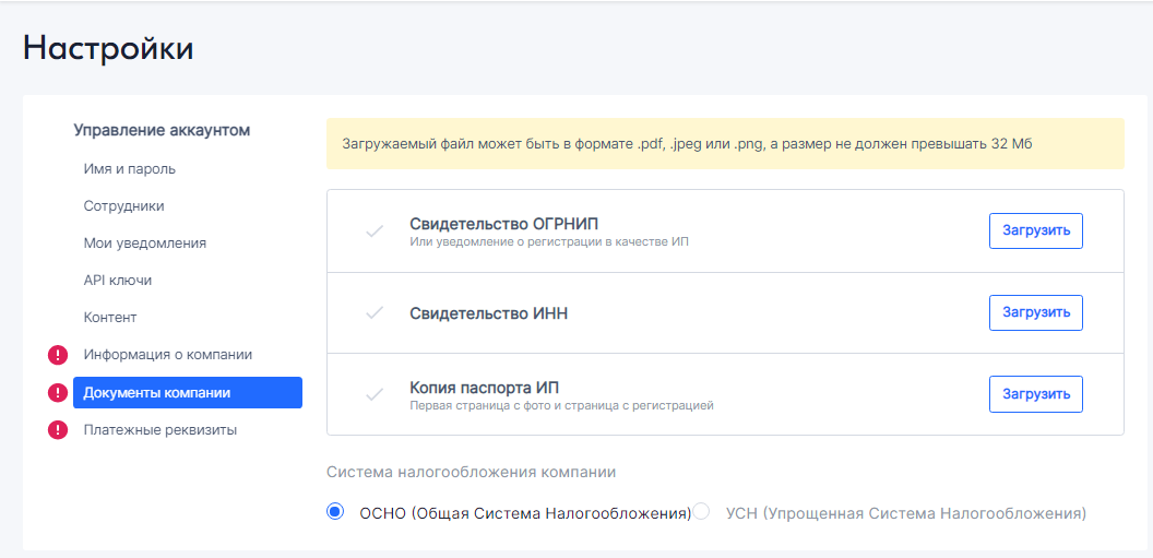 Остается загрузить документы в блок «Документы компании». ИНН, ОГРН или лист записи ЕГРЮЛ, устав компании и документ (решение / приказ) о назначении генерального директора, если у вас ООО. Если хотите продавать в статусе ИП – свидетельство ОГРНИП или лист записи ЕГРИП, ИНН и копию паспорта.
