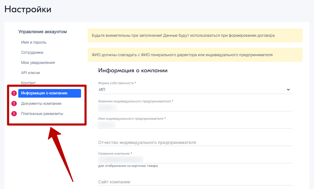 На этом этапе вы заполняете данные о компании – те, которые помечены на следующем скриншоте красными восклицательными знаками.