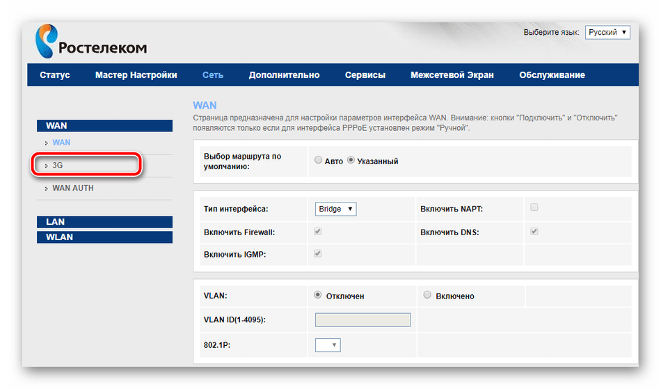 - Через «Обслуживание» включить перезагрузку и дождаться подключения модема.