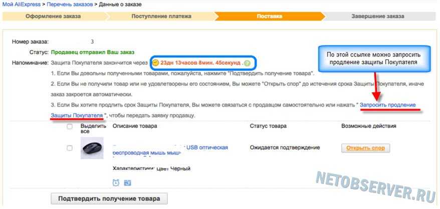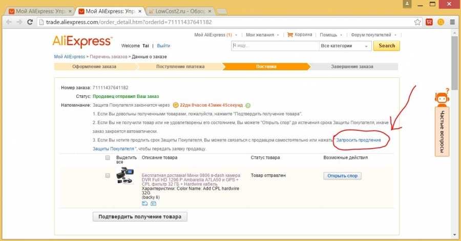 Инструкция по продлению срока защиты заказа на «Aliexpress».