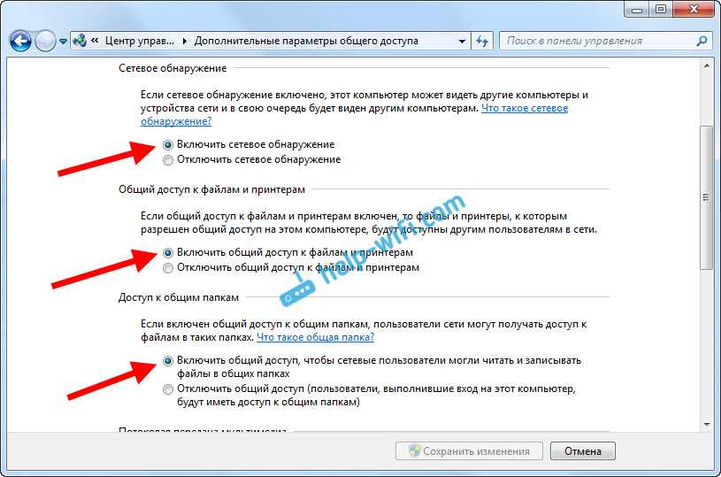 Первым делом, ставим переключатель возле Включить сетевое обнаружение. Так же, включаем Общий доступ к файлам и принтерам, и включаем общий доступ к папкам. Смотрите скриншот ниже.