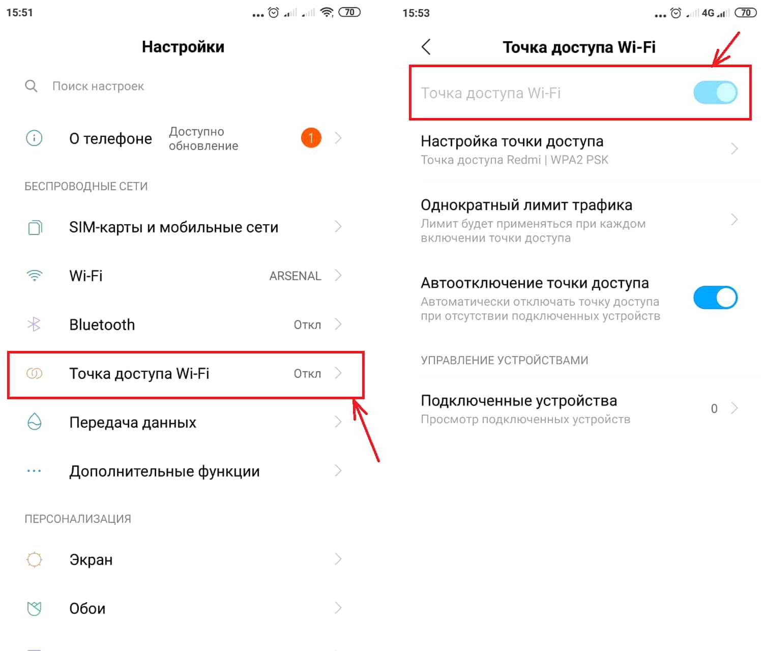 Раздача с телефона на телефон точки доступа осуществляется следующим образом: