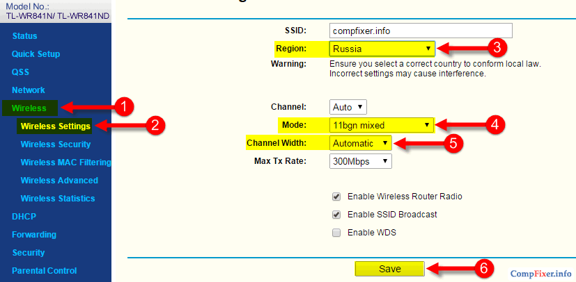 - Проверьте настройки региона в роутере. Укажите правильный регион. Попробуйте выбрать Россию, затем США, затем Чили. Это может влиять на чувствительность приёмника и мощность передатчика. Имейте в виду, что на многих моделях роутеров может не быть настройки региона.