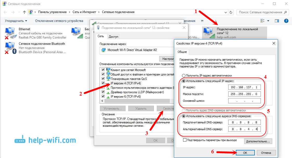 Проверьте настройки IP для «Подключение по локальной сети*». Нажмите правой кнопкой мыши на подключение, которое появилось после запуска точки доступа (оно со звездочкой и цифрой), и выдерите «Свойства». Затем, выделите «IP версии 4 (TCP/IPv4)», и нажмите на кнопку «Свойства». Если там уже заданы какие-то IP, и устройства к запущенной Wi-Fi сети не подключаются, то выставьте автоматическое получение IP и DNS. Перезагрузите ноутбук, запустите сеть, проверьте настройки общего доступа, и пробуйте подключится.