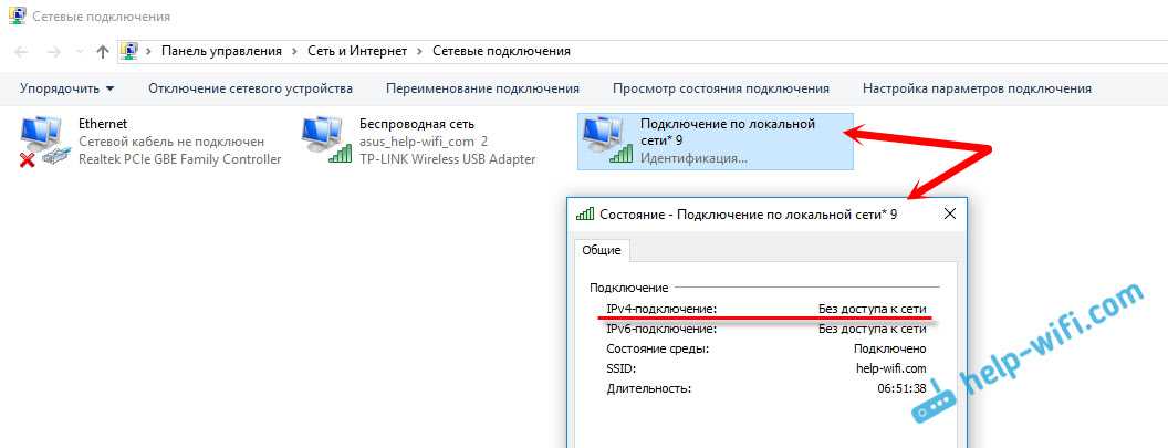 Если общий доступ к интернету не открыт, то в свойствах запущенного подключения, будет «IPv4-подключение» – «Без доступа к сети», или «Без доступа к интернету».
