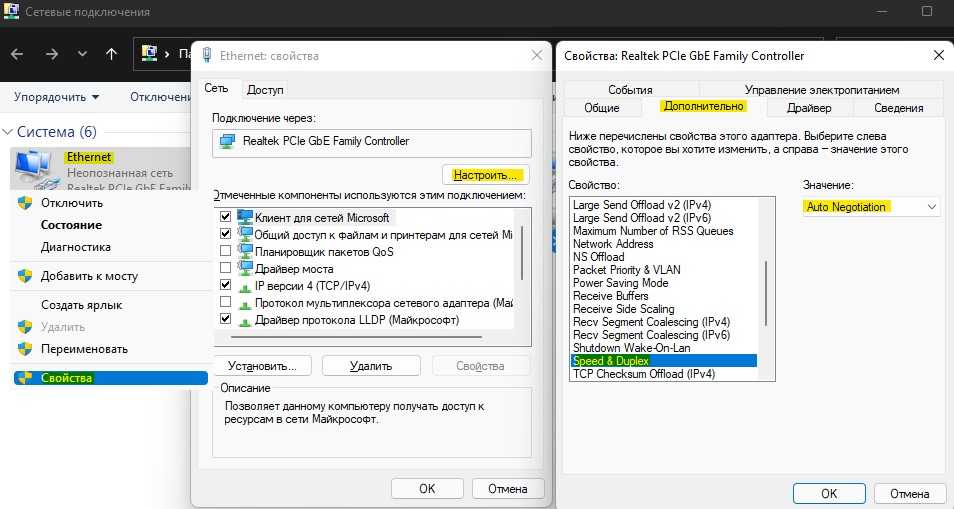 Перейдите обратно в сетевые подключения нажав Win+R и введя ncpa.cpl. Щелкните правой кнопкой мыши по сетевому адаптеру, который выдает неопознанную сеть без доступа к интернету и выберите Свойства. Далее нажмите на кнопку Настроить, после чего в новом окне перейдите во вкладку Дополнительно. Найдите слово Duplex и справа установите значение на Auto.