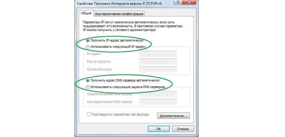 Здесь следует убедиться в том, что все параметры получаются автоматически. Если это так, то на пунктах, которые выделены на рисунке №12, будут стоять галочки, как это и показано на данном рисунке. В противном случае следует поставить эти галочки напротив пунктов «получать … автоматически» и нажать кнопку ОК.