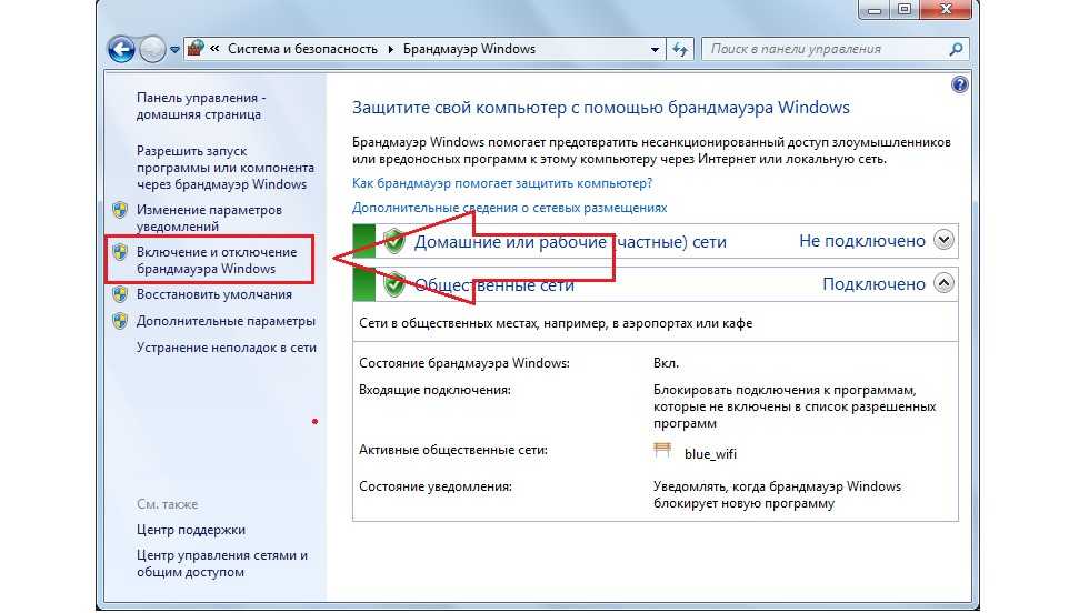 В меню, которое располагается с левой стороны, нужно выбрать пункт «Включение и отключение брандмауэра Windows».