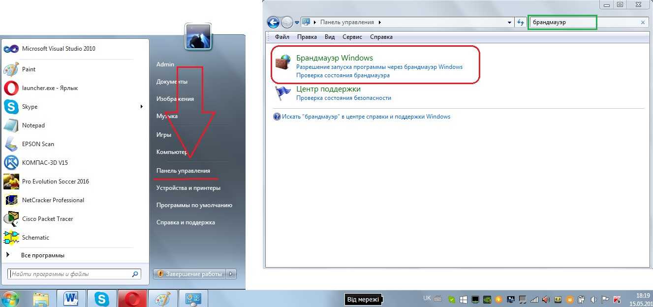 В меню «Пуск» открыть «Панель управления». Там найти пункт, называемый «Брандмауэр Windows». Если сразу его отыскать не удается, нужно ввести соответствующий запрос в строку поиска, что выделено зеленым цветом на рисунке №13, после чего нажать на кнопку Enter. После нахождения следует открыть этот самый пункт «Брандмауэр Windows» путем нажатия на него левой кнопкой мыши.