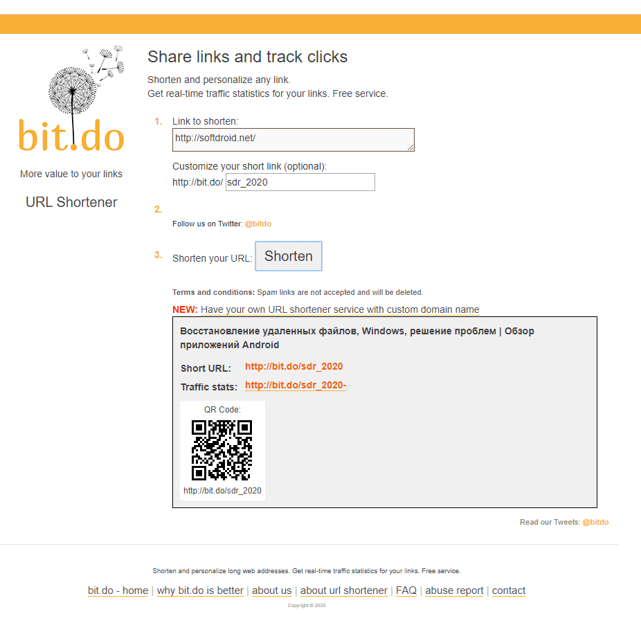 У Bitly тоже есть такой вариант, но он закрыт платным тарифом. В плюсы такого решения можно отнести только то, что приставку bit.ly сейчас узнает кто угодно. Но это всё ещё хуже ссылки, в начале которой стоит название компании.