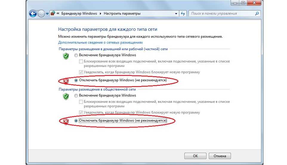 В открывшемся окне нужно поставить галочки напротив пунктов, связанных с отключением служб брандмауэра (выделены на рисунке №15).