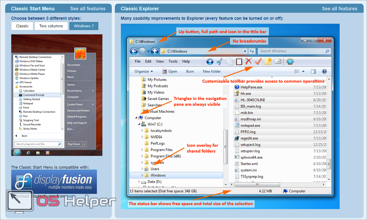 которую можно на нашем ресурсе, позволяет вернуть классическое оформление раздела «Пуск», тем самым избавившись от плиточного интерфейса. Помимо этого, данное приложение будет полезно для пользователей, которые используют стандартный браузер Internet Explorer. Утилита позволит вернуть классический вид строки состояния, а также значительно расширяет возможности проводника.