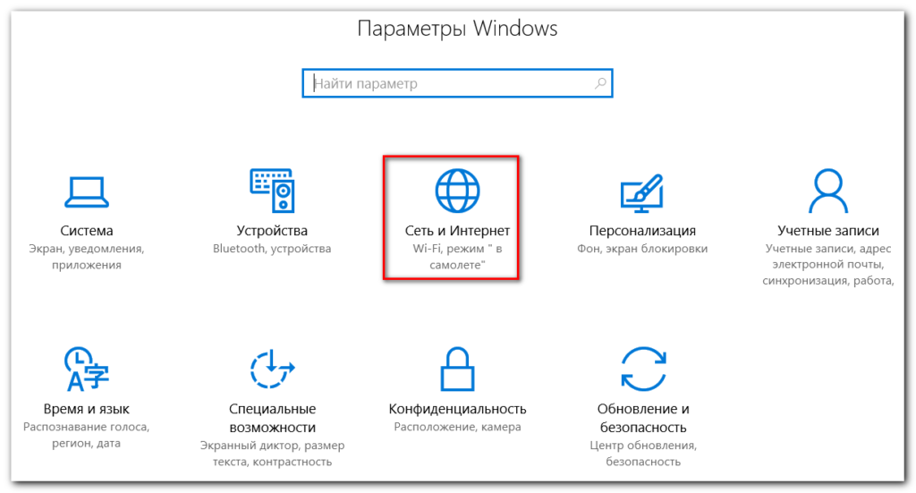 - Открываем окно с параметрами и находим пункт «Сеть и интернет»;