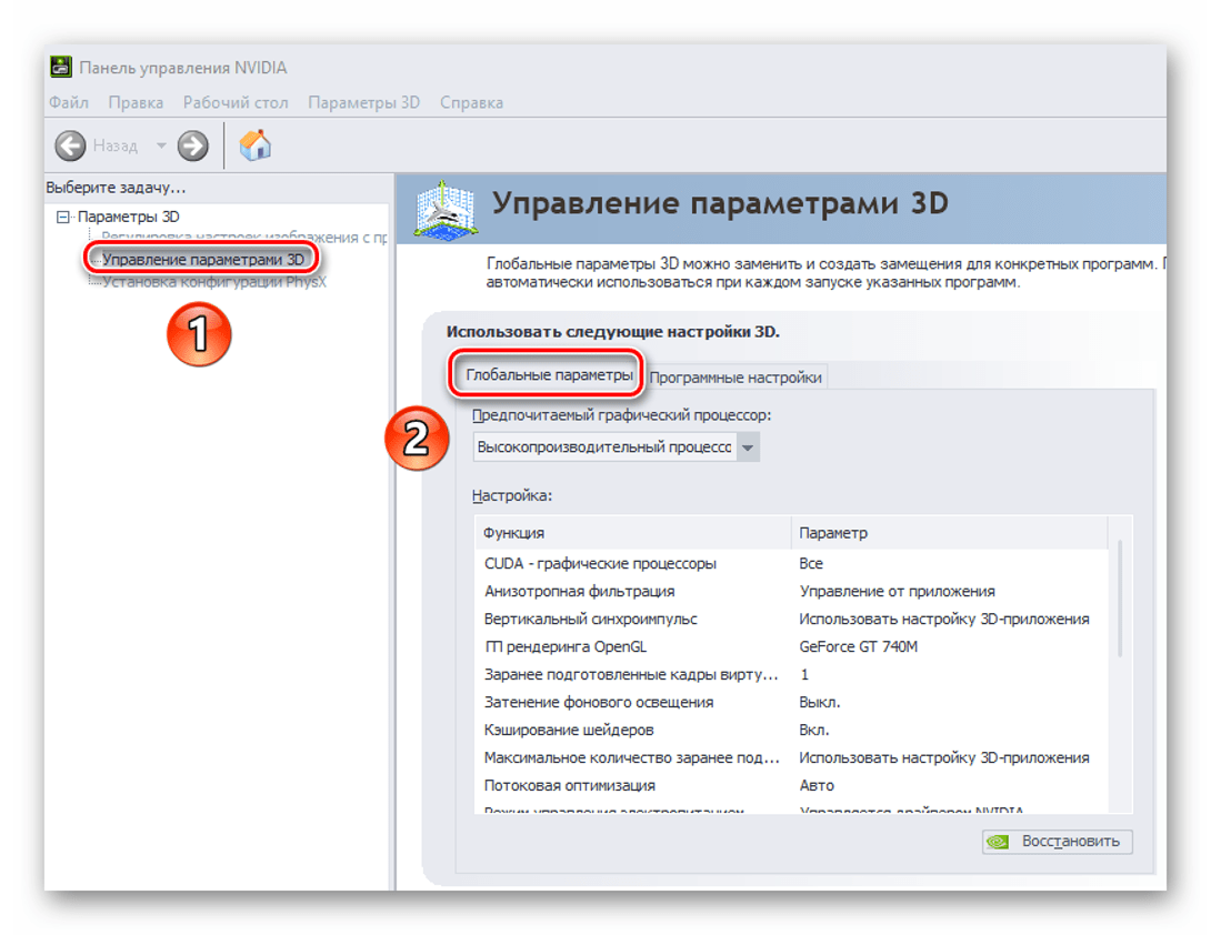 Выберите в левой половине окна раздел «Управление параметрами 3D», а затем справа активируйте блок «Глобальные параметры».