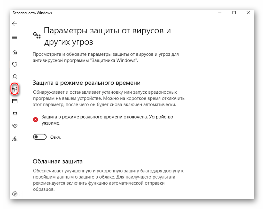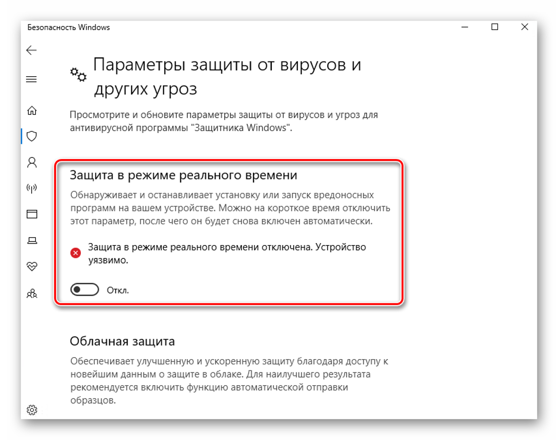 Рассмотрим пример с отключением встроенного защитника ОС: