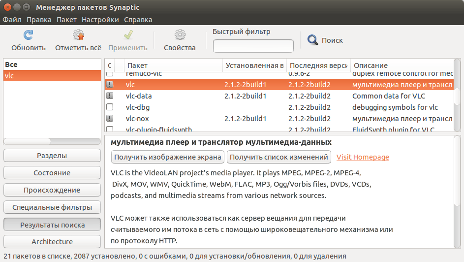 С помощью Synaptic можно очень просто и удобно просматривать, какие пакеты у вас уже установлены, удалять их, обновлять (если обновления доступны), а также искать в репозиториях нужные пакеты по имени или описанию. Для всего этого в Synaptic есть очень хороший набор фильтров по категориям («Игры», «Администрирование», «Интернет» и т.д.), по состоянию («Установленные», «Не установленные», «Установленные вручную», «Обновляемые» и т.д.), по происхождению (т.е. из какого источника установлена или может быть установлена та или иная программа) и другие.