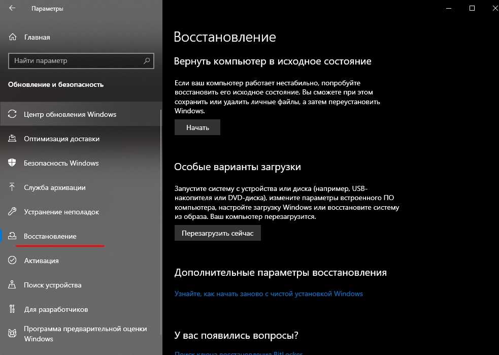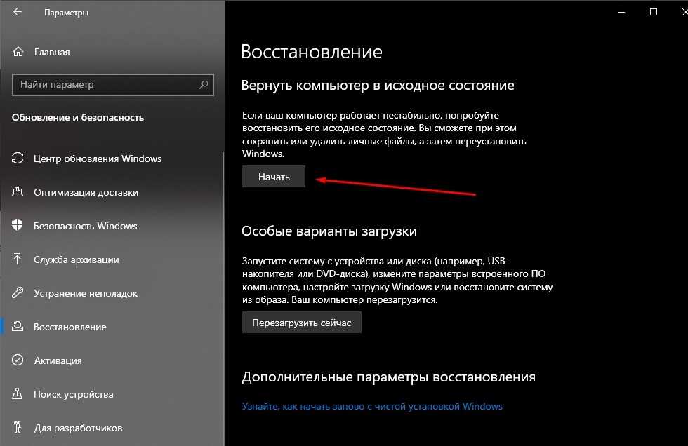 Под заголовком «Вернуть компьютер в исходное состояние» нажать кнопку «Начать».