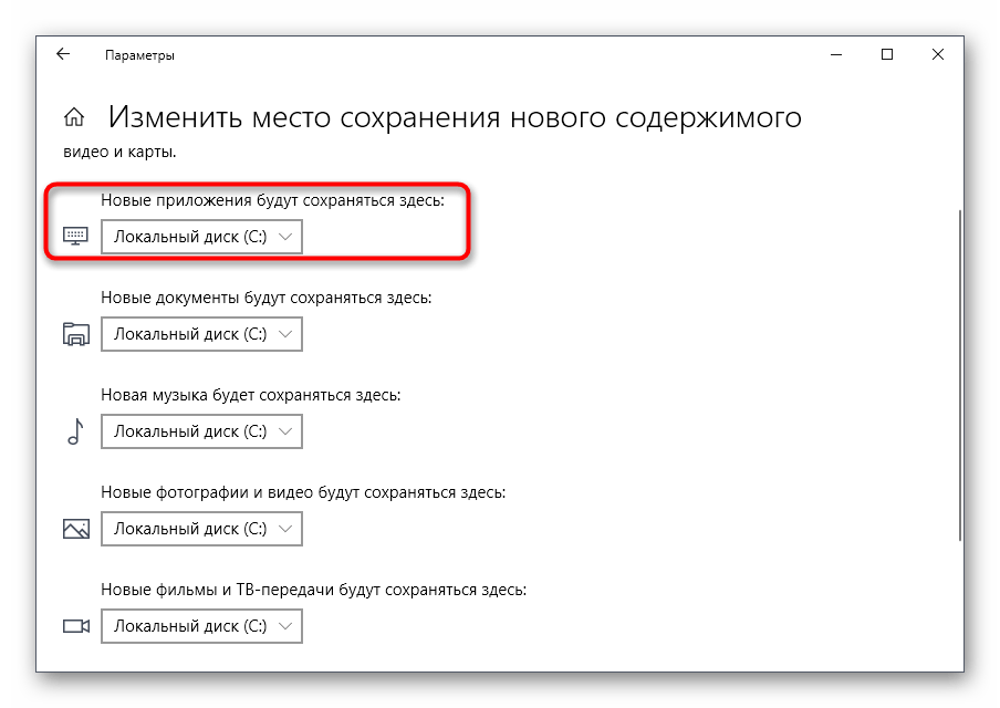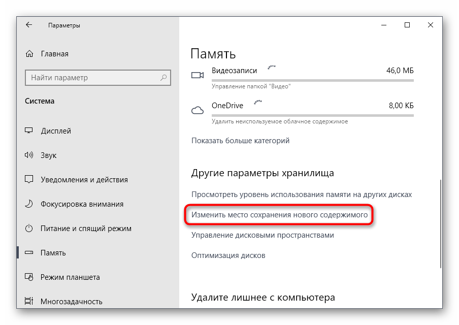 Опуститесь вниз и нажмите по кликабельной строке «Изменить место сохранения нового содержимого».
