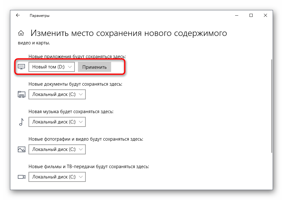 В первом же пункте «Новые приложения будут сохраняться здесь» поменяйте логический том.
