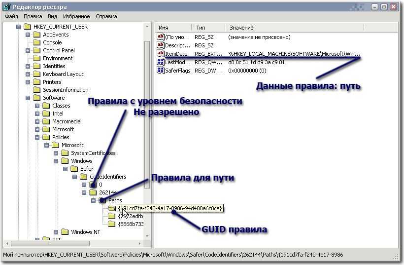 Эта запись «переводится» так: родительский процесс winlogon.exe, имеющий значение идентификатора (PID) 452, выполнил запуск C:\Windows\system32\userinit.exe; правило, вызвавшее «срабатывание» — правило для пути с уровнем безопасности Неограниченный (Unrestricted), имеет код GUID {191cd7fa-f240-4a17-8986-94d480a6c8ca}. Каждое правило имеет свой идентификатор GUID. После того, как политика ограниченного использования программ применена, ее конфигурация хранится в системном реестре. Список контроля доступа, защищающий разделы реестра, позволяет только администраторам и учетной записи SYSTEM изменять ее. Политика пользователя хранится в разделе HKCU\Software\Policies\Microsoft\Windows\, политика компьютера хранится в разделе HKLM\SOFTWARE\Policies\Microsoft\Windows\.