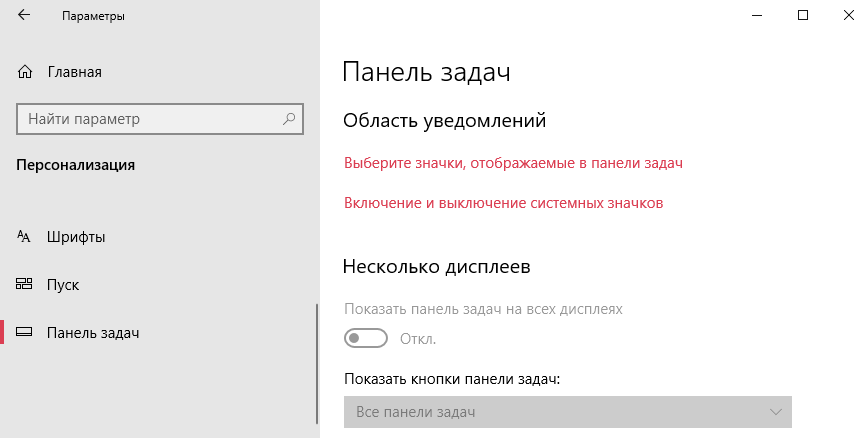 Переходим в Пуск > Параметры > Персонализация > Панель задач. Актуально для последней сборки операционной системы Windows 10. Ранее настройка значков на панели задач располагалась в разделе Система > Уведомления и действия.
