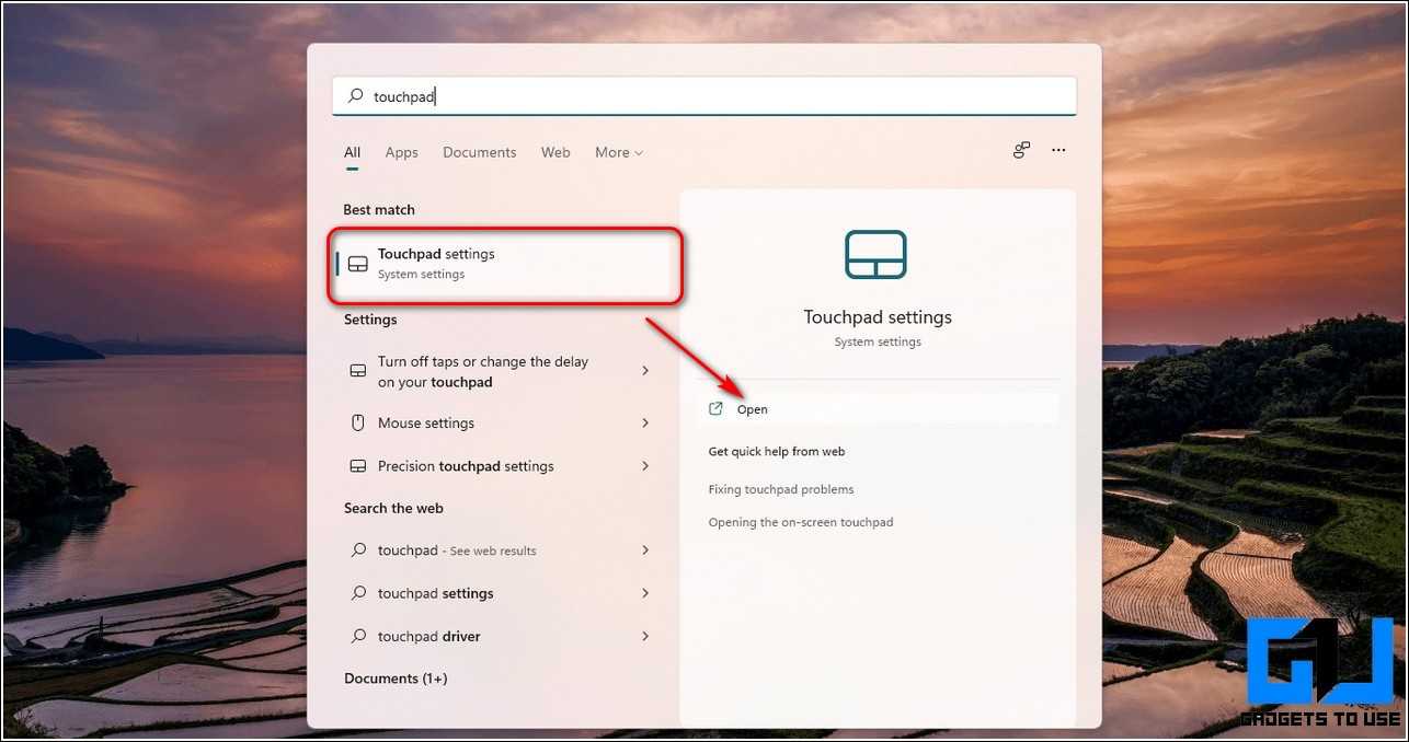 Нажмите клавишу Windows и найдите настройки сенсорной панели, чтобы открыть ее.